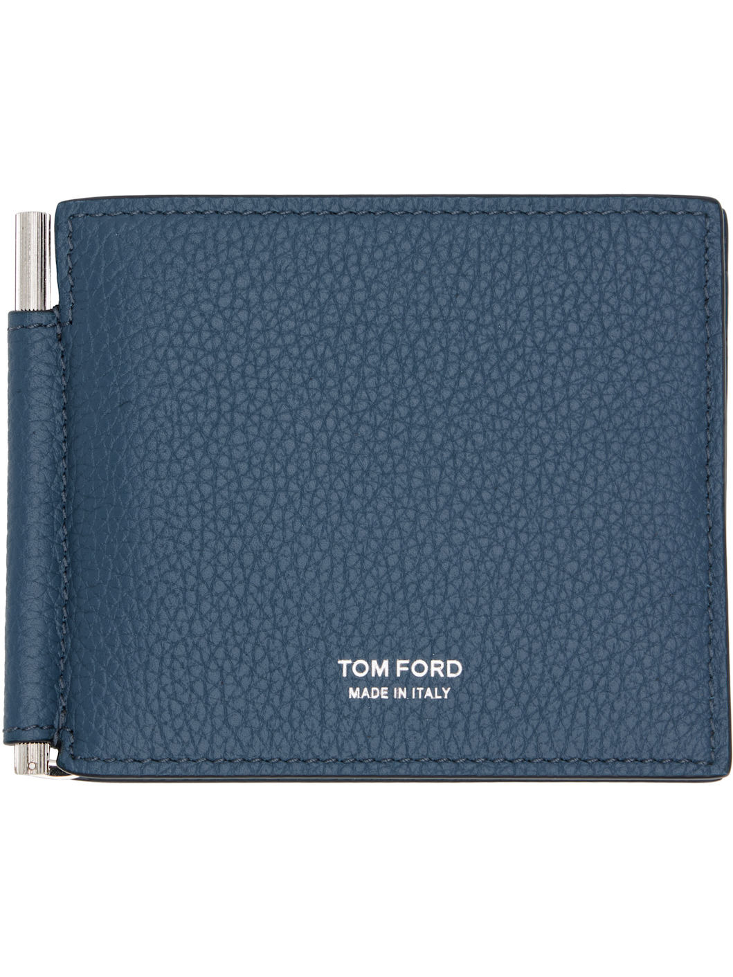 Pebble-grained calfskin bifold wallet. · Silver-tone logo stamp at face · Eight card slots and money clip at interior · Sheepskin lining · Silver-tone hardware · H3.5" x W4.5" x D0.5" Supplier color: Indigo Calfskin. Made in Italy 252076M164000