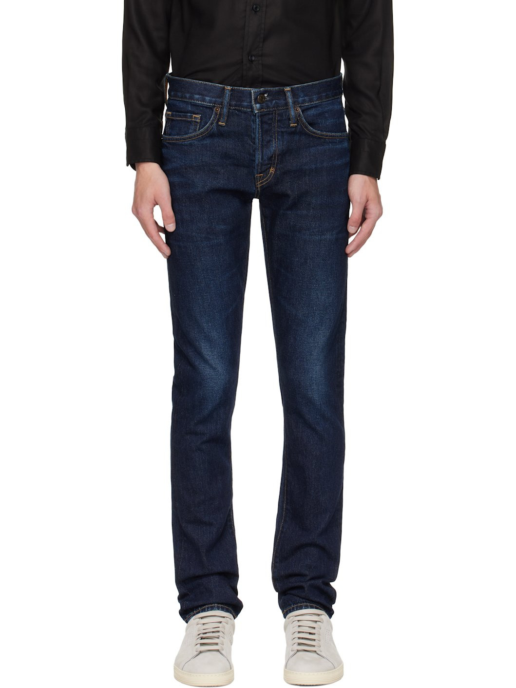Stretch denim jeans. · Fading throughout · Belt loops · Five-pocket styling · Button fly · Leather logo patch at back waistband · Contrast stitching in tan Supplier color: Deep Indigo 98% cotton, 2% polyurethane. Made in United States 252076M186003