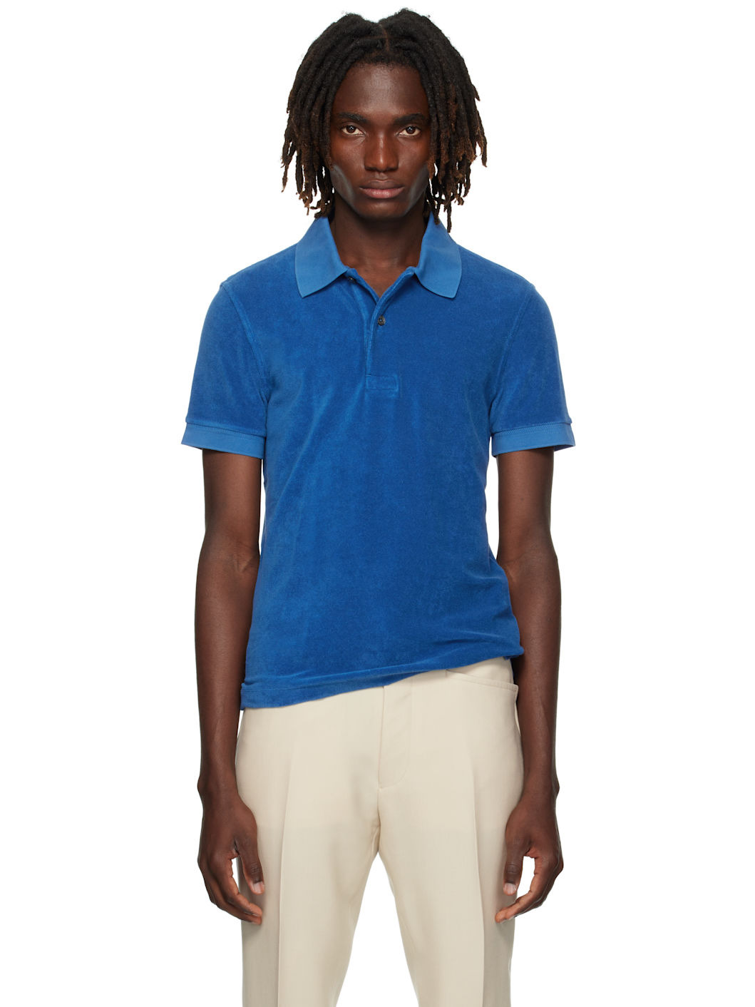 Cotton-blend terrycloth polo. · Rib-knit spread collar and cuffs · Two-button placket · Logo embroidered at front hem · Tennis-tail hem Supplier color: Denim blue Body: 80% cotton, 20% polyamide. Trim: 100% cotton. Made in Portugal 251076M212023