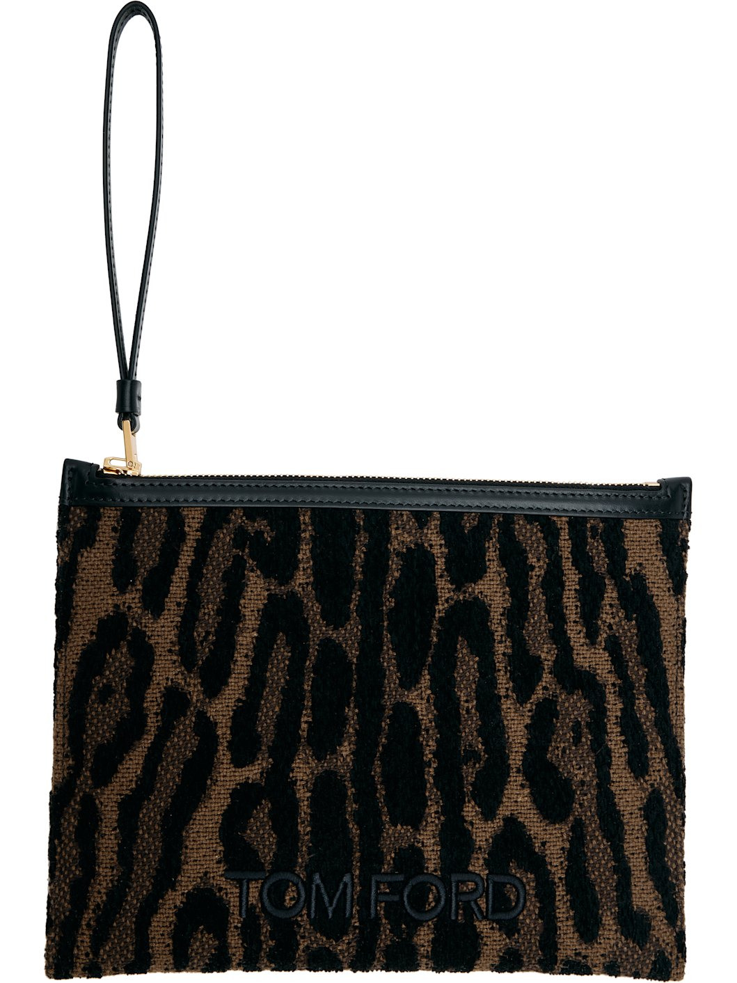 Cotton hopsack and buffed calfskin pouch. · Jacquard leopard pattern throughout · Logo embroidered at face · Wristlet at zip closure · Canvas lining · Gold-tone hardware · H7.25" x W9.5" Supplier color: Brown/Black Cotton, calfskin. Made in Italy 252076F045001