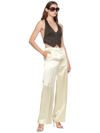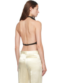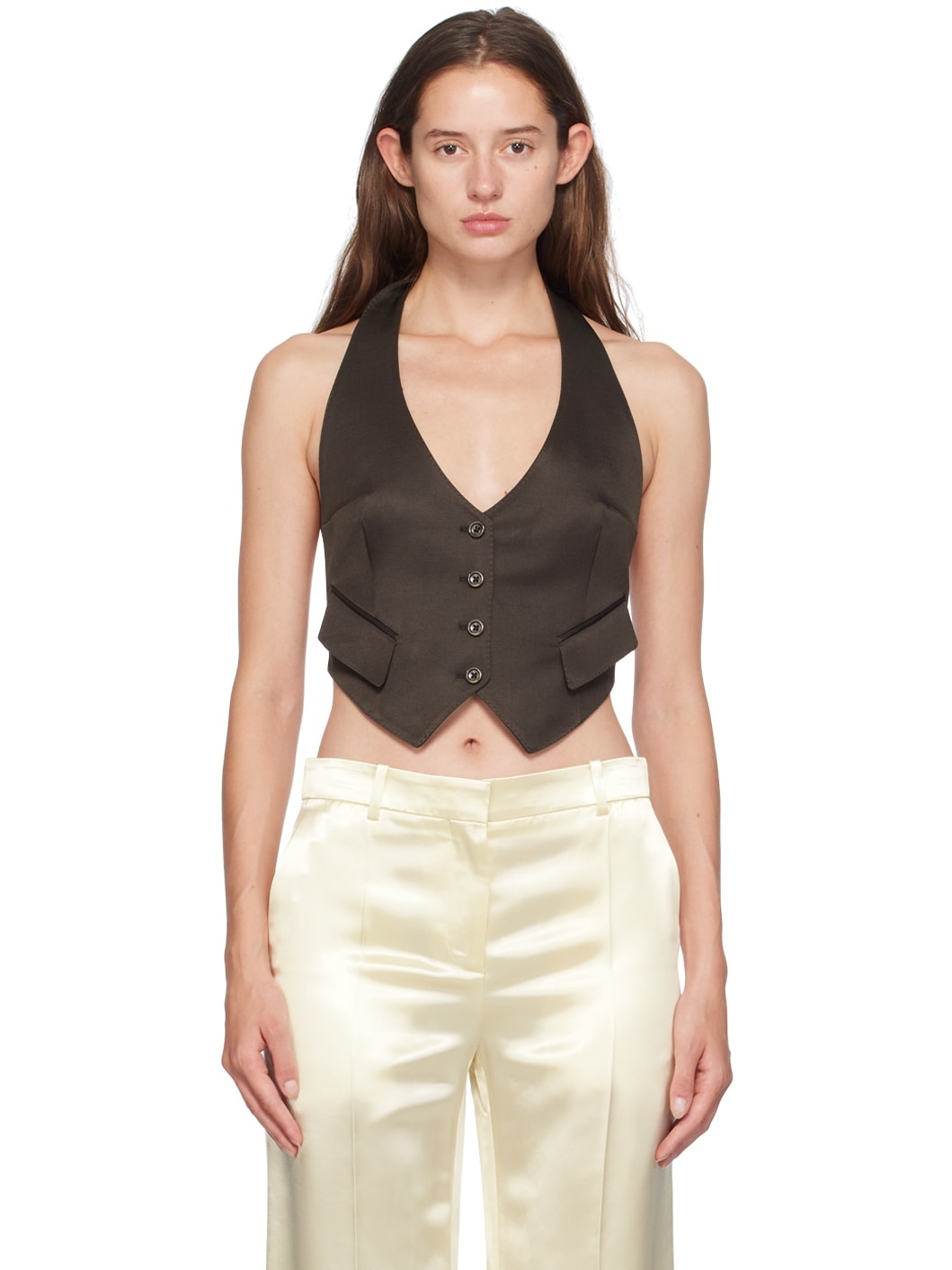 Silk- and wool-blend twill vest. · Y-neck · Button closure · Darts at chest · Flap pockets · Asymmetrical hem · Halter strap · Open back · Cinch fastening at back · Partial cupro- and silk-blend twill lining · Mother-of-pearl hardware Supplier color: Darkest brown Body: 59% silk, 41% wool. Lining: 59% cupro, 41% silk. Made in Switzerland 242076F057001