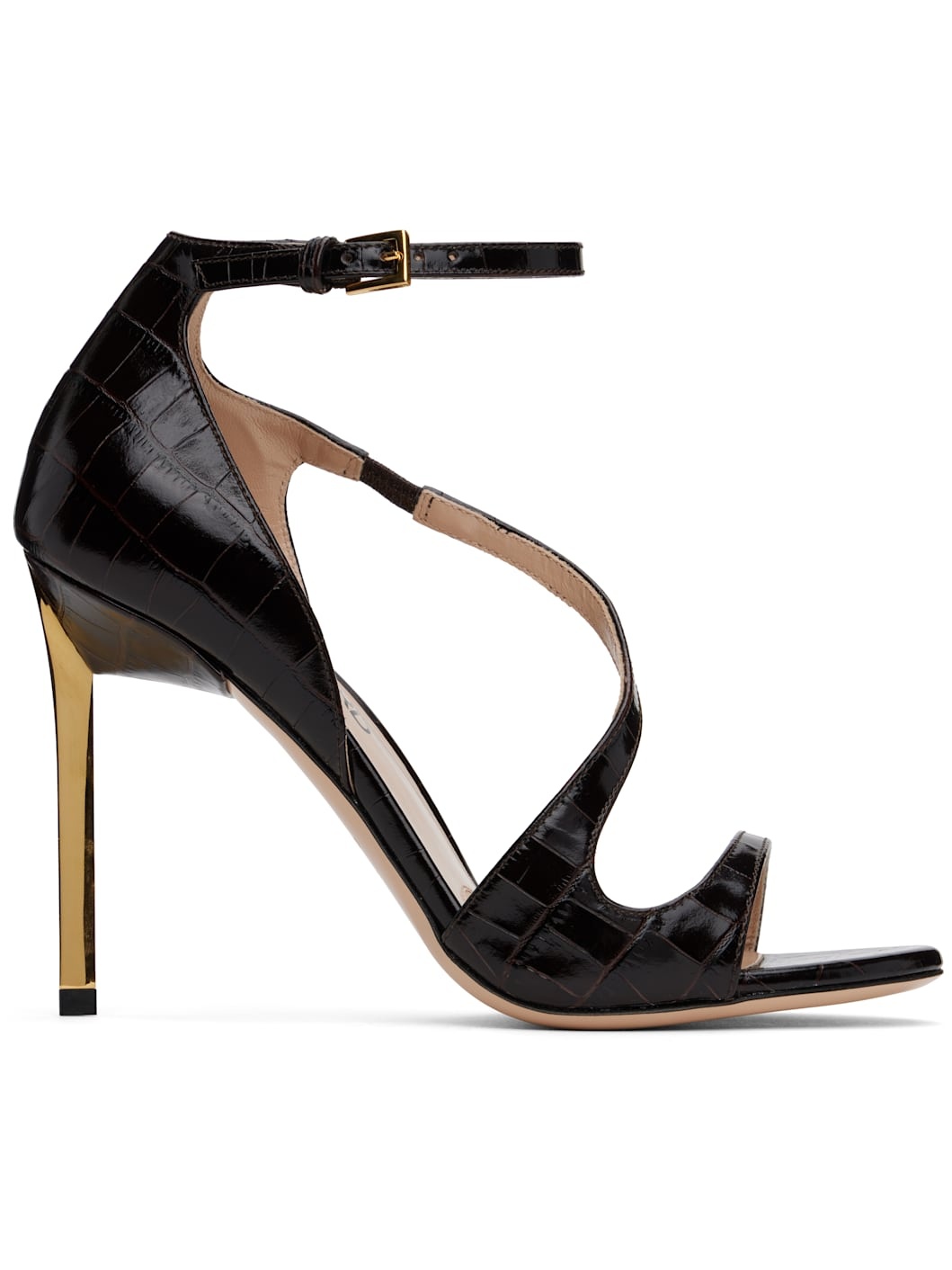 Croc-embossed patent calfskin heeled sandals in brown. · Open toe · Partially elasticized strap at vamp · Pin-buckle ankle strap · Logo-printed buffed leather and suede footbed · Metal stiletto heel with rubber injection · Polished leather sole · Heel: H4" Supplier color: Espresso Upper: calfskin. Sole: leather. Made in Italy 242076F125020
