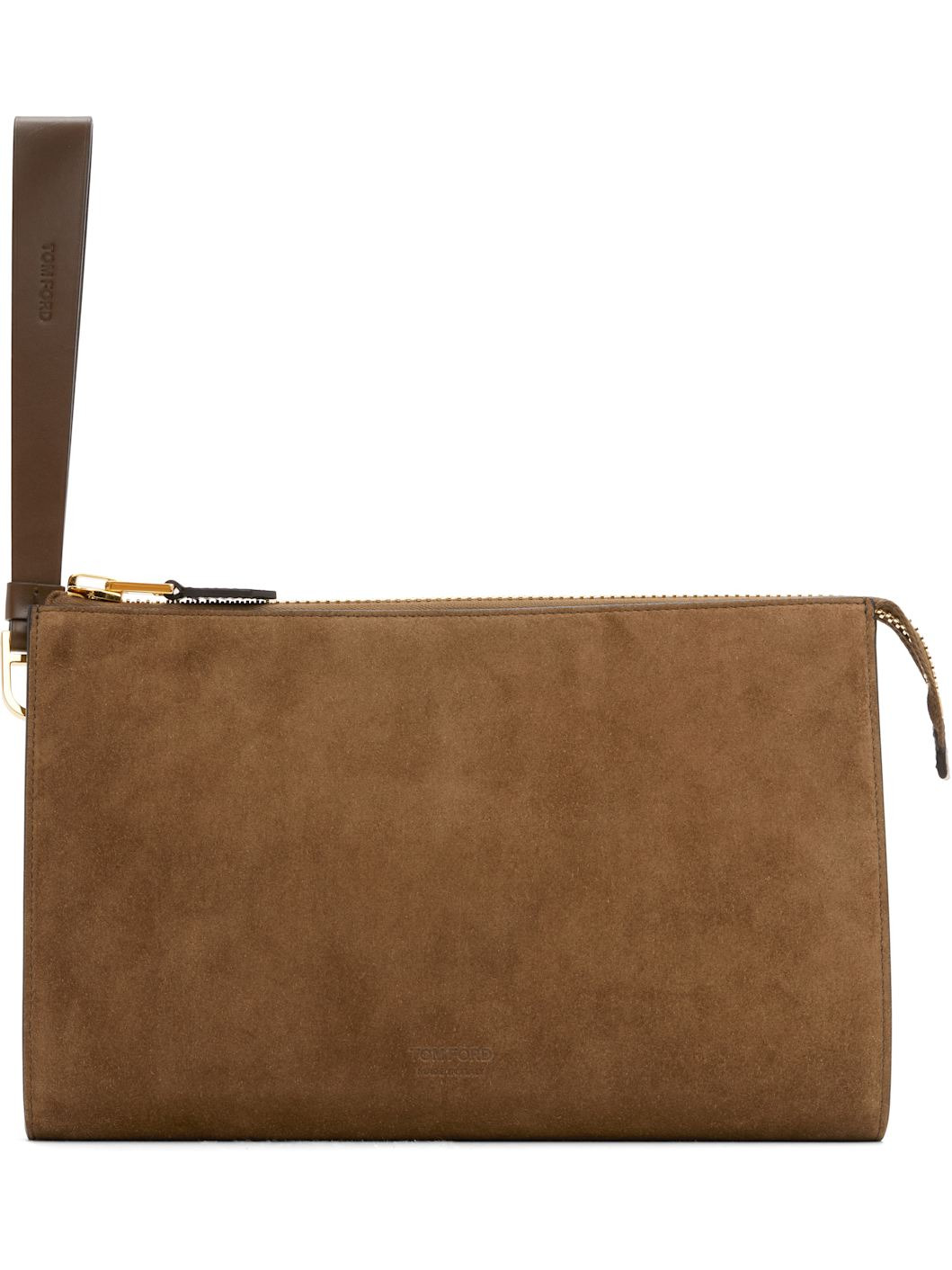Calfskin suede pouch. · Logo-embossed wristlet at top · Gold-tone logo stamp at face · Zip closure · Patch pocket at interior · Cotton-blend twill lining · Gold-tone hardware · H7" x W10.25" x D1" Supplier color: Walnut Calfskin. Made in Italy 252076M171004