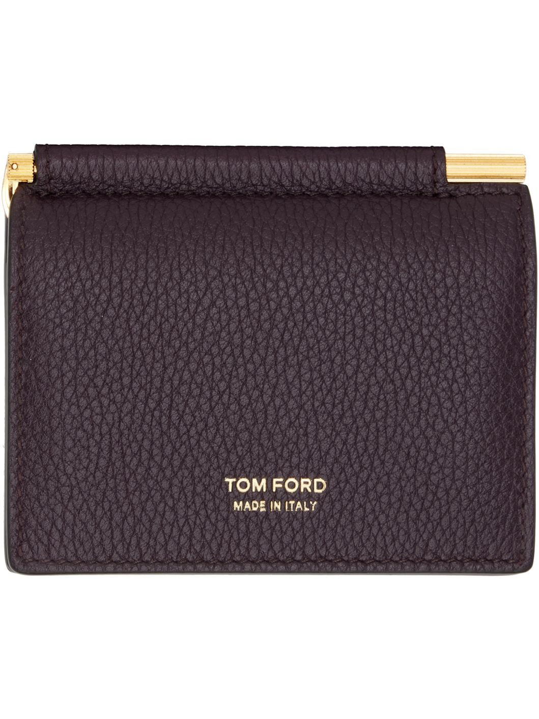 Pebble-grained calfskin card holder. · Gold-tone logo stamp at face · Card slot at back face · Four card slots and money clip at interior · Moire lining · Gold-tone hardware · H3.25" x W4" Supplier color: Oxblood Calfskin. Made in Italy 252076M163017
