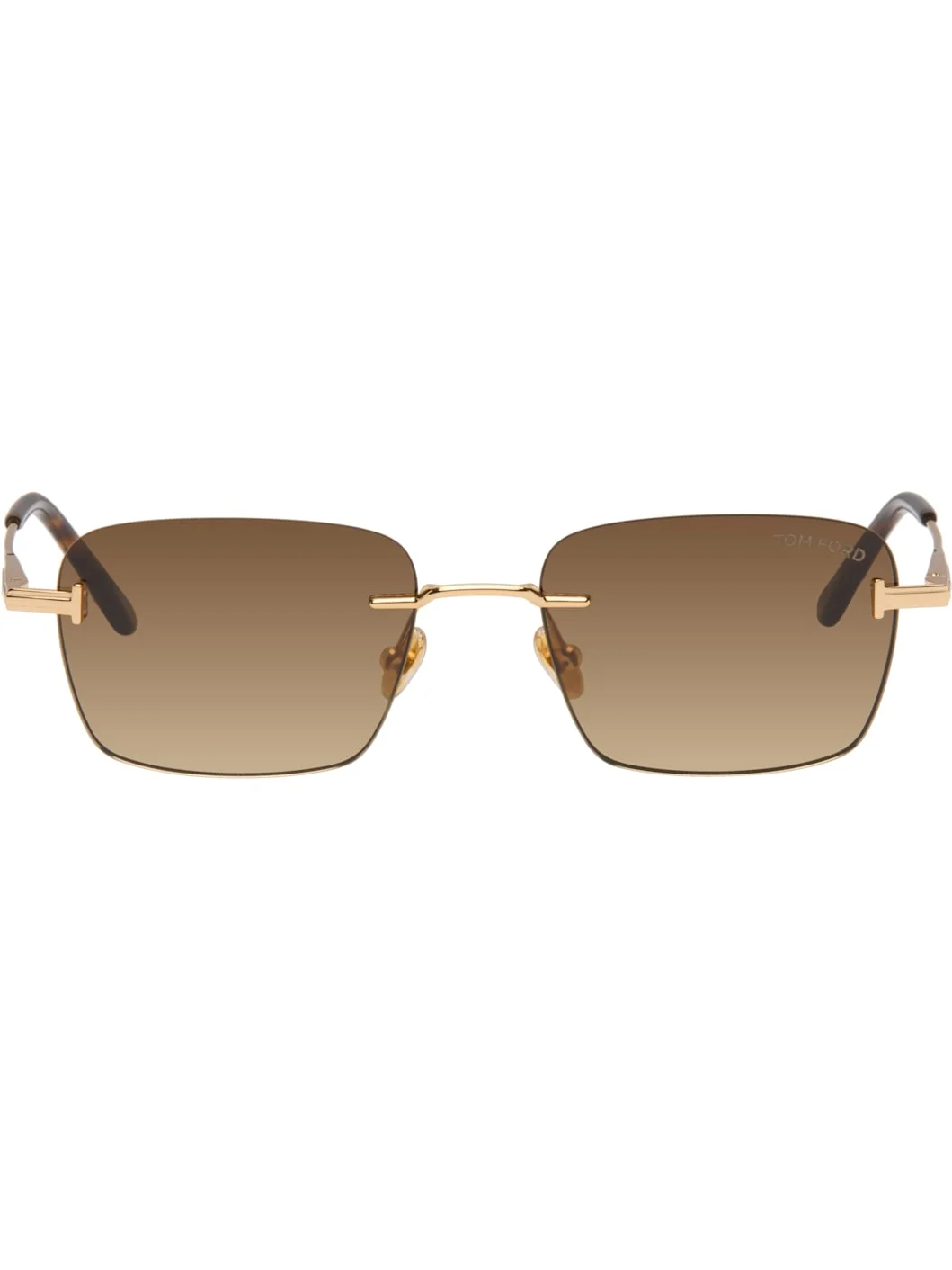 Rectangular rimless metal-frame sunglasses. · Brown gradient lenses · Logo etched at lens · Adjustable rubber nose pads · Logo hardware at hinges and tips · Tortoiseshell acetate temple tips · Size: 54.18 145 Supplier color: Shiny yellow gold Metal. Made in Italy 261076F005008