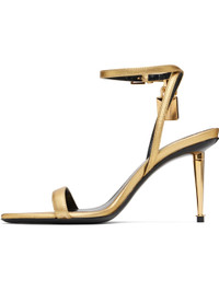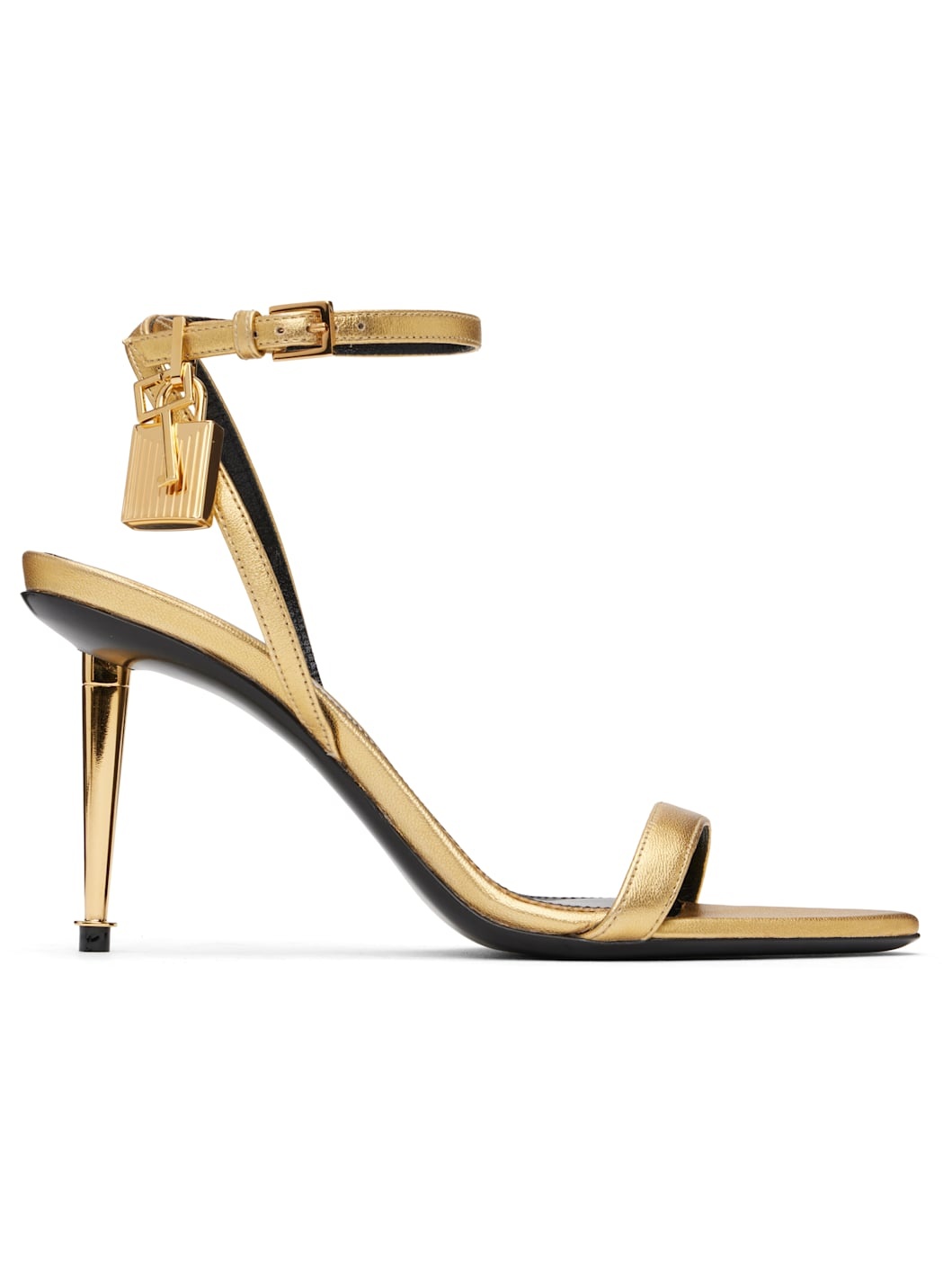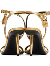 Laminated nappa leather heeled sandals in gold tone. · Pointed toe · Padlock and logo charm at pin-buckle ankle strap · Metal stiletto heel with rubber injection · Leather sole · Logo-engraved gold-tone hardware · Heel: H3.25" Supplier color: Gold Upper: leather. Sole: leather, metal, rubber. Made in Italy 251076F125000