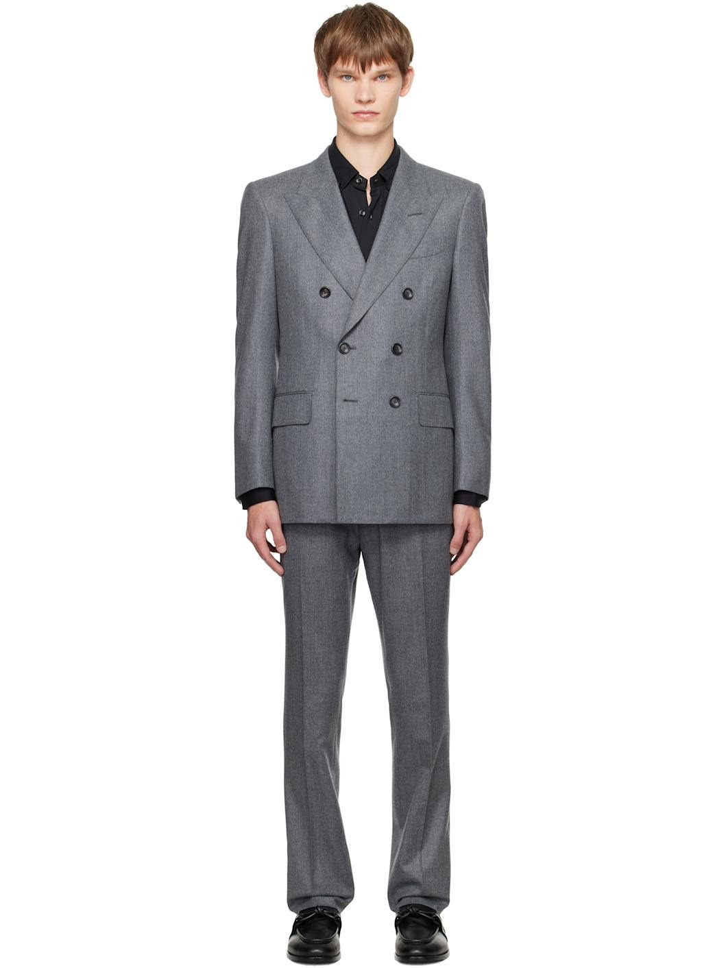 Wool flannel blazer. · Peaked lapel · Double-breasted button closure · Welt pocket at chest · Flap pockets at waist · Padded shoulders · Surgeon's cuffs · Central vent at back hem · Welt pockets at interior · Partial satin lining · Horn hardware Wool flannel trousers. · Cinch tabs at waistband · Four-pocket styling · Zip fly · Creased legs · Unfinished hem · Partial satin lining Supplier color: Dark grey Body: 100% wool. Lining 1: 59% cupro, 41% silk. Lining 2: 100% cupro. Made in Italy 252076M196001
