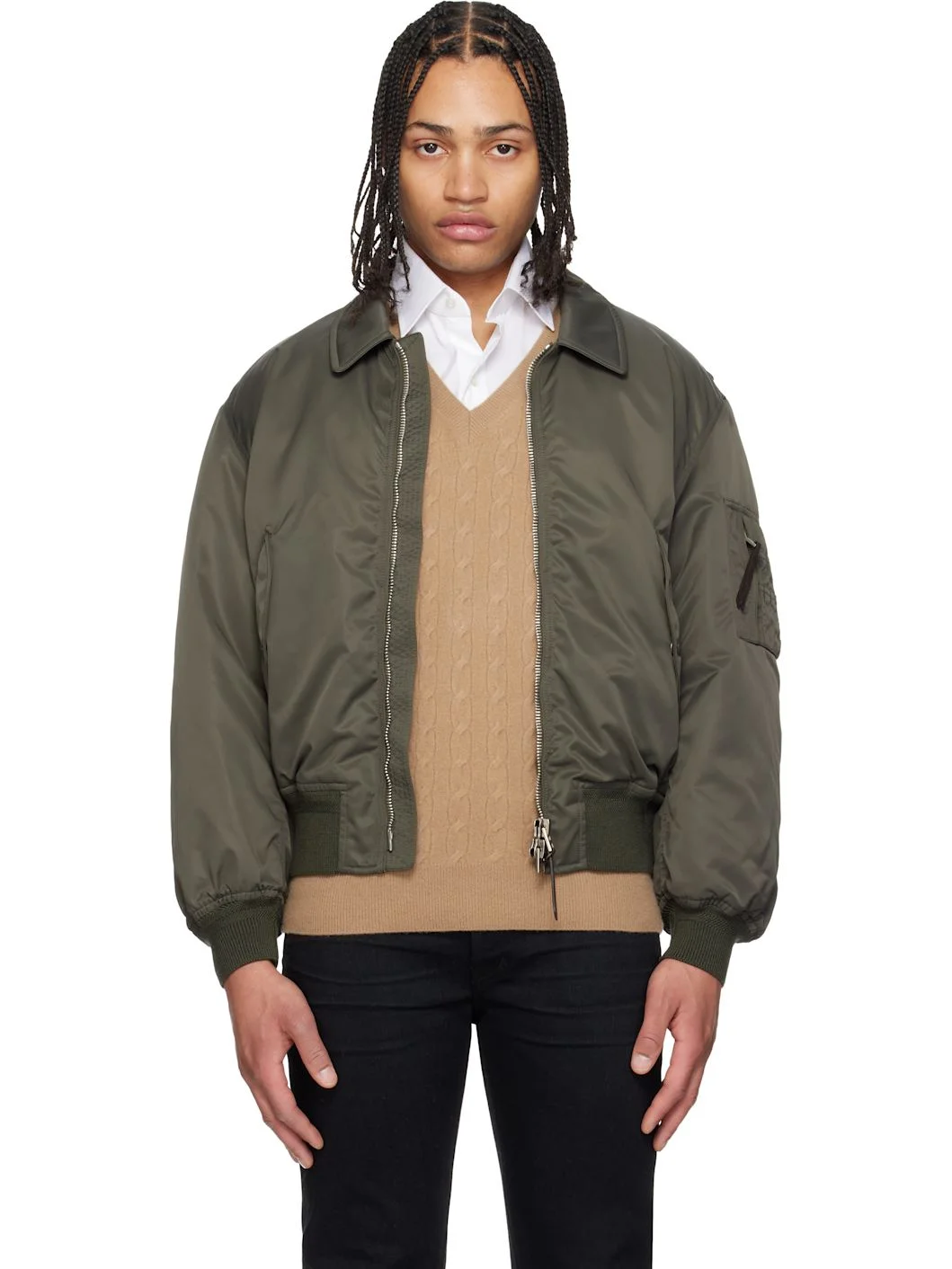 Padded nylon satin bomber jacket. · Spread collar · Two-way zip closure · Flap pockets at front · Rib-knit hem and cuffs · Dropped shoulders · Utility pocket at sleeve · Twin pleats at back · Welt pocket at interior · Full quilted twill lining Supplier color: Military green Body: 100% nylon. Trim: 92% virgin wool, 7% nylon, 1% elastane. Fill: 100% polyester. Lining: 60% cupro, 40% cotton. Made in Italy 261076M175000