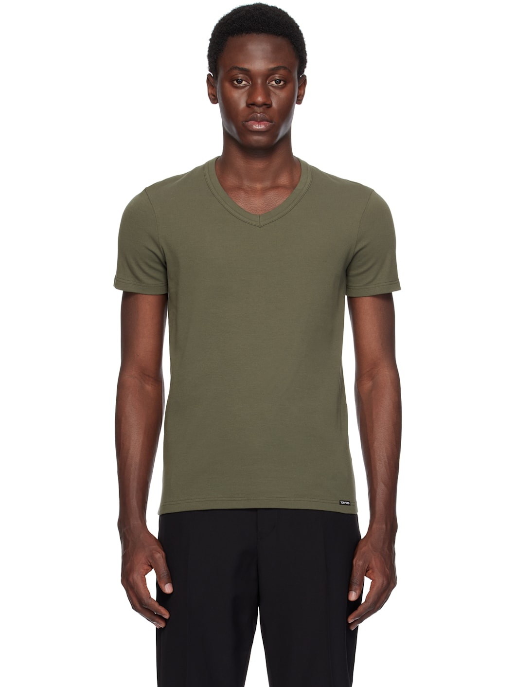 Stretch cotton jersey T-shirt. · Rib-knit V-neck · Logo patch at front hem Supplier color: Military green 90% cotton, 10% elastane. Made in Bosnia And Herzegowina 251076M213005