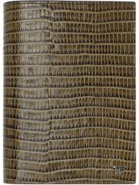 Lizard-embossed calfskin passport holder. · Inset logo hardware at face · Six card slots at interior · Two passport slots · Moire lining · Silver-tone hardware · H5.75" x W4" x D1" Supplier color: Slate Calfskin. Made in Italy 252076M162001