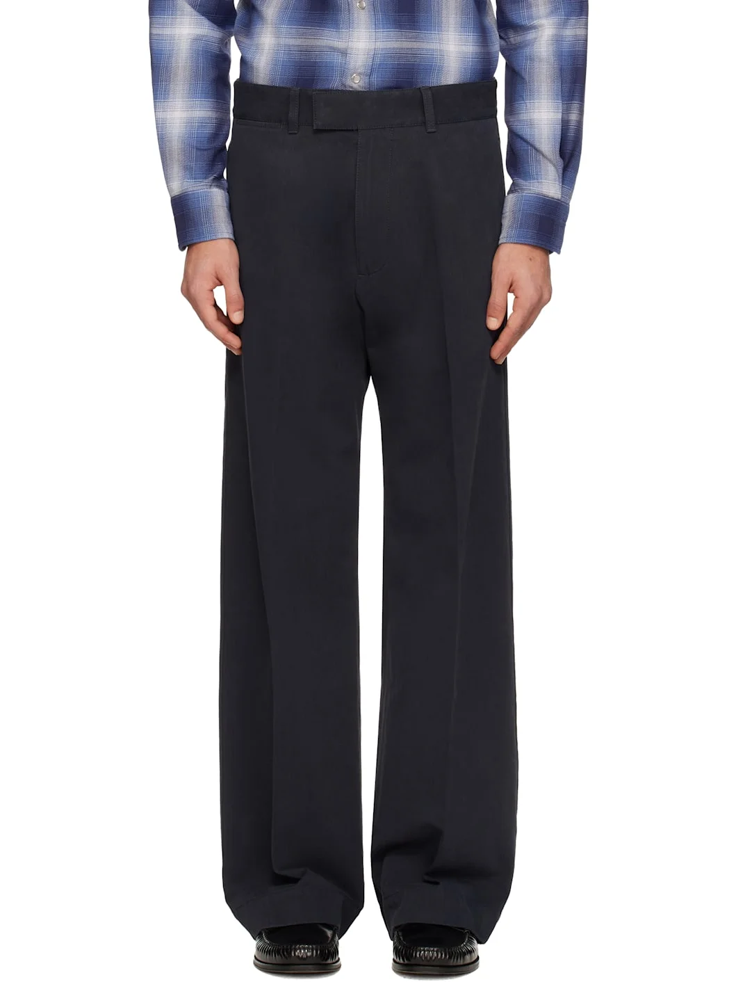 Cotton drill trousers. · Wide-leg · Belt loops · Five-pocket styling · Zip fly · Central crease at front and back legs · Darts and cinch strap at back waistband · Horn hardware Supplier color: Navy Body: 100% cotton. Pocket lining: 100% cotton. Made in Italy 261076M191003