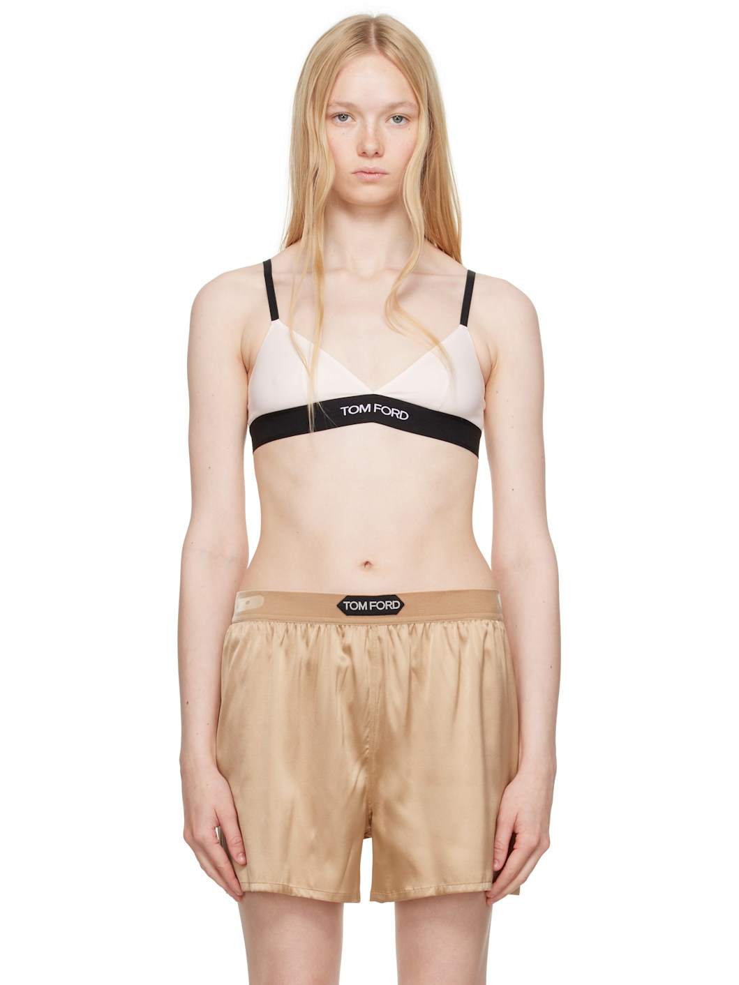 Stretch modal jersey bra. · V-neck · Dart at cups · Jacquard logo at elasticized hem · Adjustable spaghetti straps · Adjustable hook-eye fastening at back · Logo-engraved gold-tone hardware Supplier color: Champagne pink Body: 97% modal, 3% elastane. Trim: 82% polyester, 9% elastane, 9% nylon. Made in Italy 251076F073002