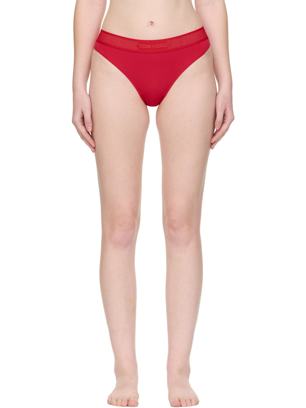 Stretch modal jersey thong. · Jacquard logo at elasticized waistband · Partial stretch jersey lining Supplier color: Scarlet Body: 97% modal, 3% elastane. Trim: 82% polyester, 9% nylon, 9% elastane. Made in Bosnia And Herzegowina 252076F081000