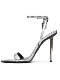 Laminated grained nappa sheepskin heeled sandals. · Open pointed toe · Padlock and logo charm at pin-buckle ankle strap · Logo printed at leather footbed · Metal stiletto heel with rubber injection · Polished leather sole · Logo-engraved silver-tone hardware · Heel: H4.25" Supplier color: Silver Upper: sheepskin. Sole: leather, rubber, metal. Made in Italy 252076F125001