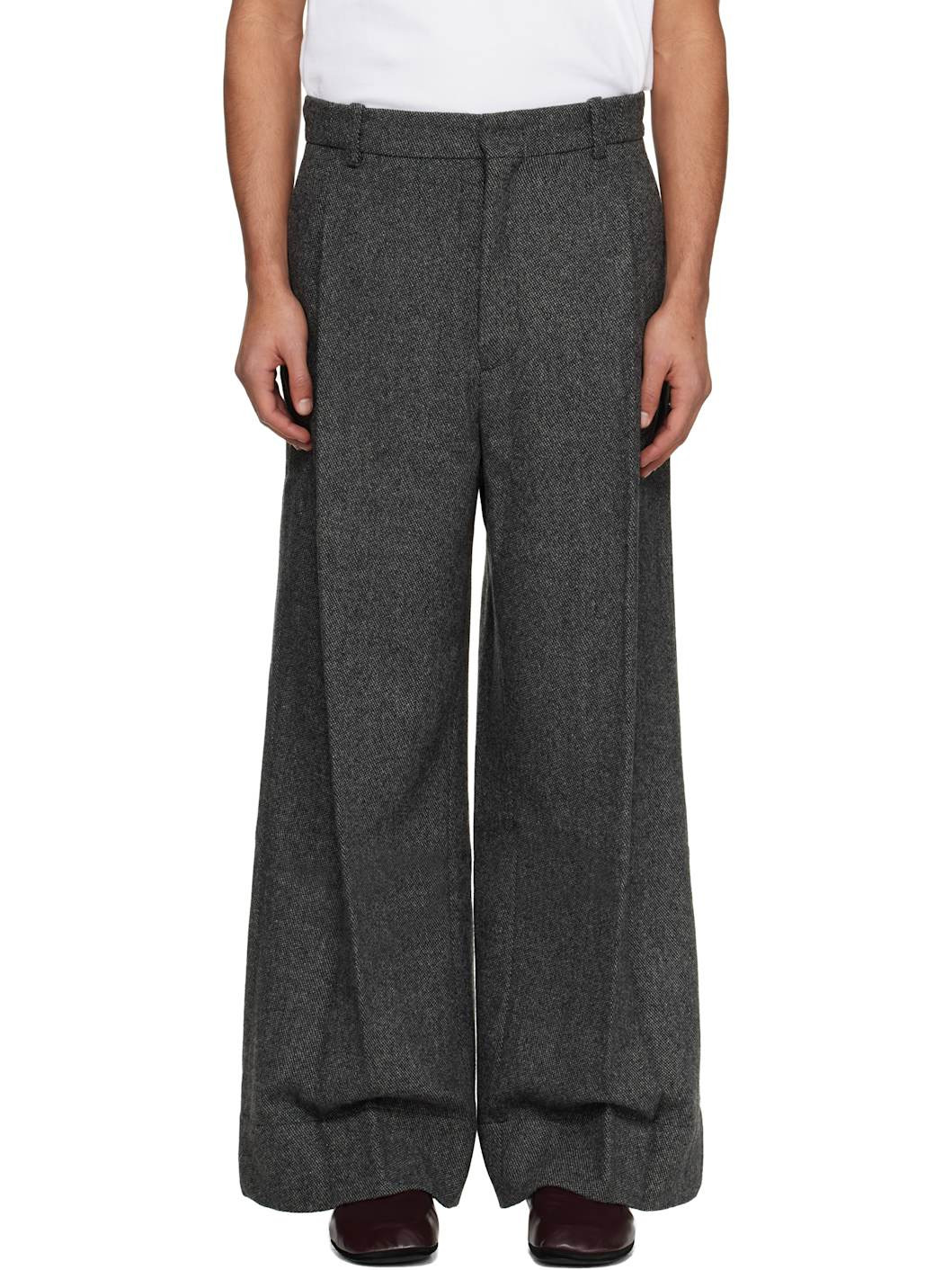 Wool-blend tweed trousers. · Wide-leg · Belt loops · Four-pocket styling · Zip fly · Pleats at front Supplier color: Grey 50% wool, 50% polyester. Made in South Korea 252251M191005