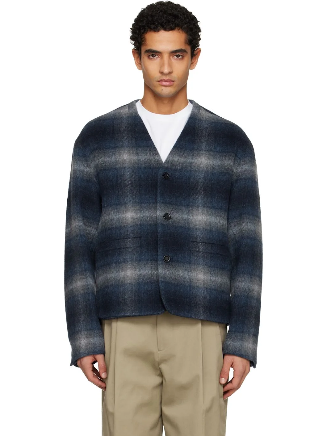 Wool-blend flannel cardigan. · Check pattern throughout · Y-neck · Button closure · Welt pockets at front · Vented side seams · Button fastening at cuffs · Welt pocket at interior · Full satin lining Supplier color: Navy/Grey Body: 55% wool, 35% polyester, 10% nylon. Lining: 50% viscose, 50% polyester. Made in South Korea 252251M200003