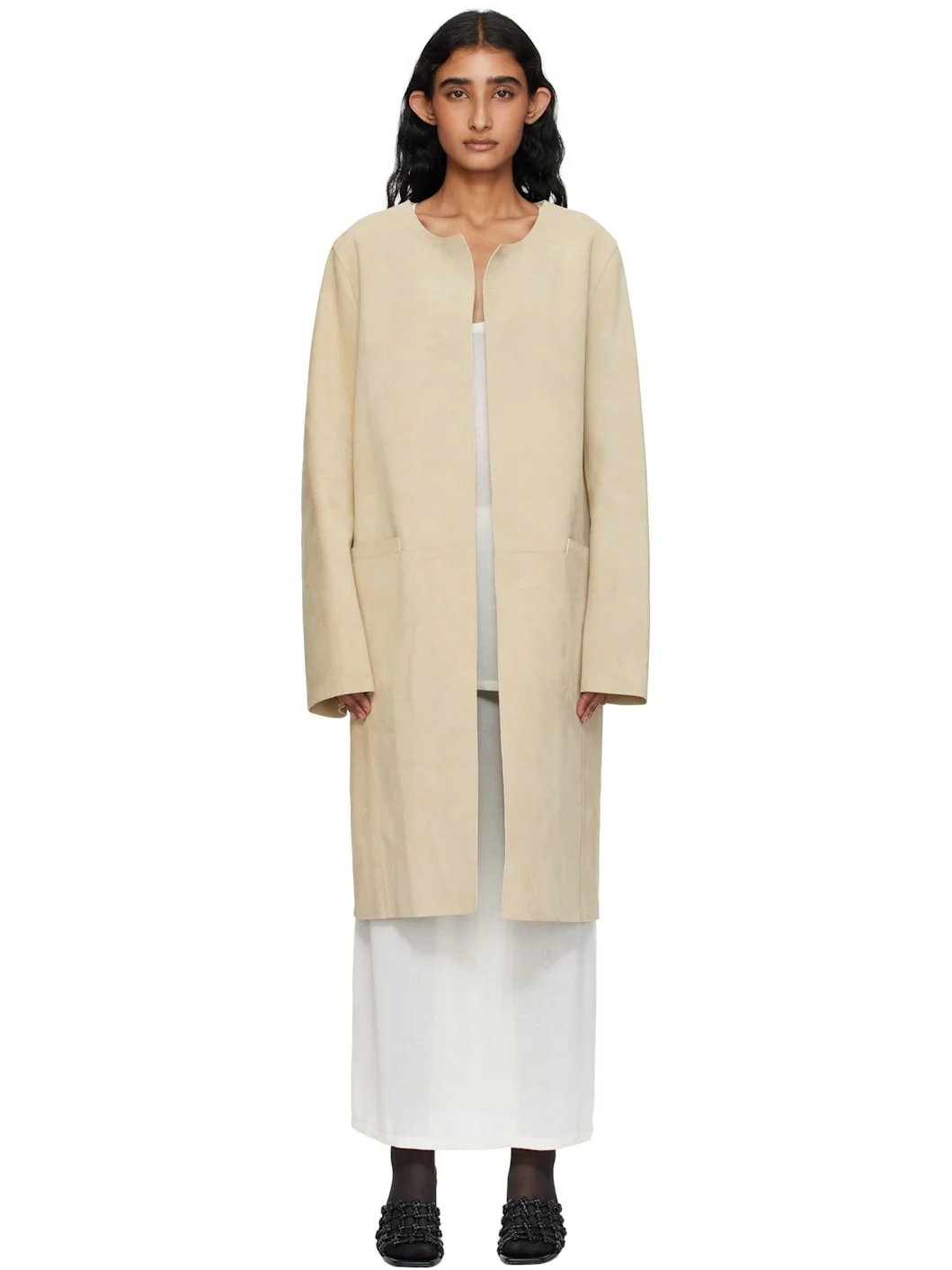 Beige Collarless Suede Coat