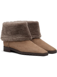 Ankle-high lambskin suede boots. · LWG-certified leather · Pointed square toe · Foldover collar · Shearling lining · Treaded rubber sole Supplier color: Taupe Upper: lambskin. Sole: rubber. Made in Italy 252771F113006