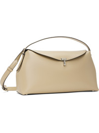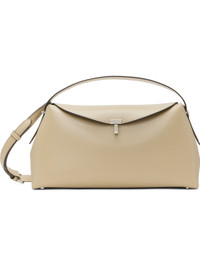 Buffed leather top handle bag in beige. · Fixed carry handle · Adjustable and detachable shoulder strap · Bumper studs at base · Twist-lock flap · Patch pockets at interior · Microsuede lining · Logo-engraved silver-tone hardware · H7" x W13.5" x D4.5" Supplier color: Fawn Body: 100% leather. Lining: 60% polyamide, 40% polyurethane. Made in Italy 251771F046007