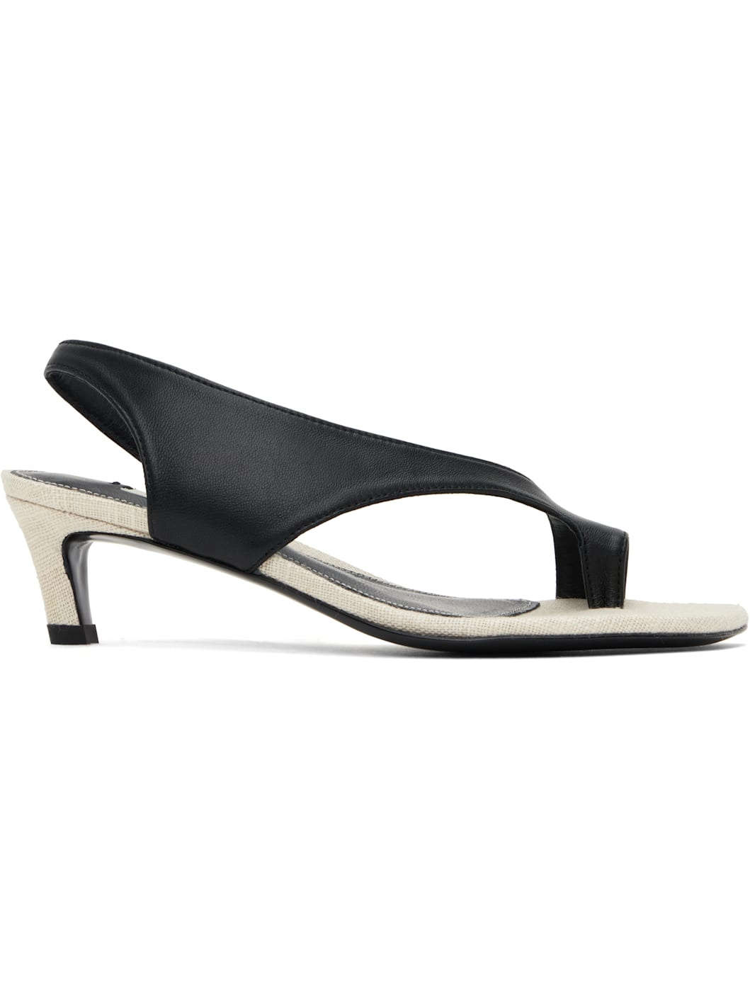 Paneled grained sheepskin and canvas heeled sandals in black and beige. · LWG-certified sheepskin · Open square toe · Thong-style strap at vamp · Elasticized slingback strap · Logo patch at padded footbed · Covered kitten heel with rubber injection · Leather sole · Heel: H2" Supplier color: Black/Sand Upper: sheepskin. Sole: textile, leather. Made in Spain 251771F125001