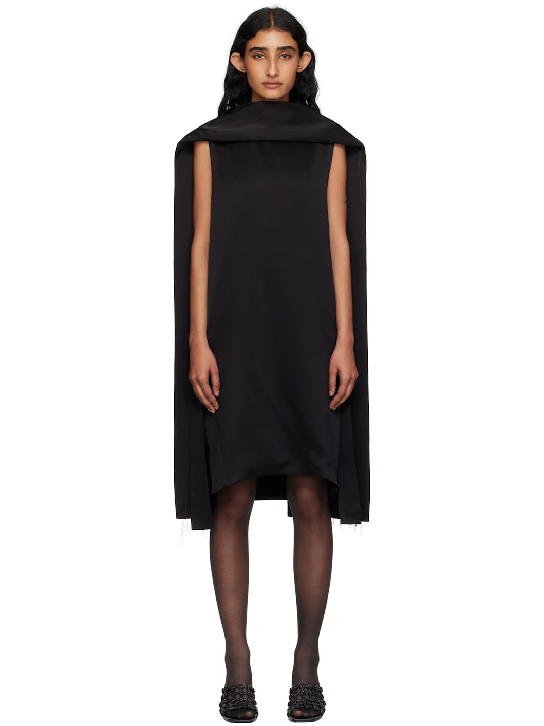 Viscose satin minidress. · Raw edges throughout · Scarf-style panel extends to back · Round neck · Seam pockets · Integrated self-tie belt · Zip closure at back collar Supplier color: Black 100% viscose. Made in Portugal 252771F052005