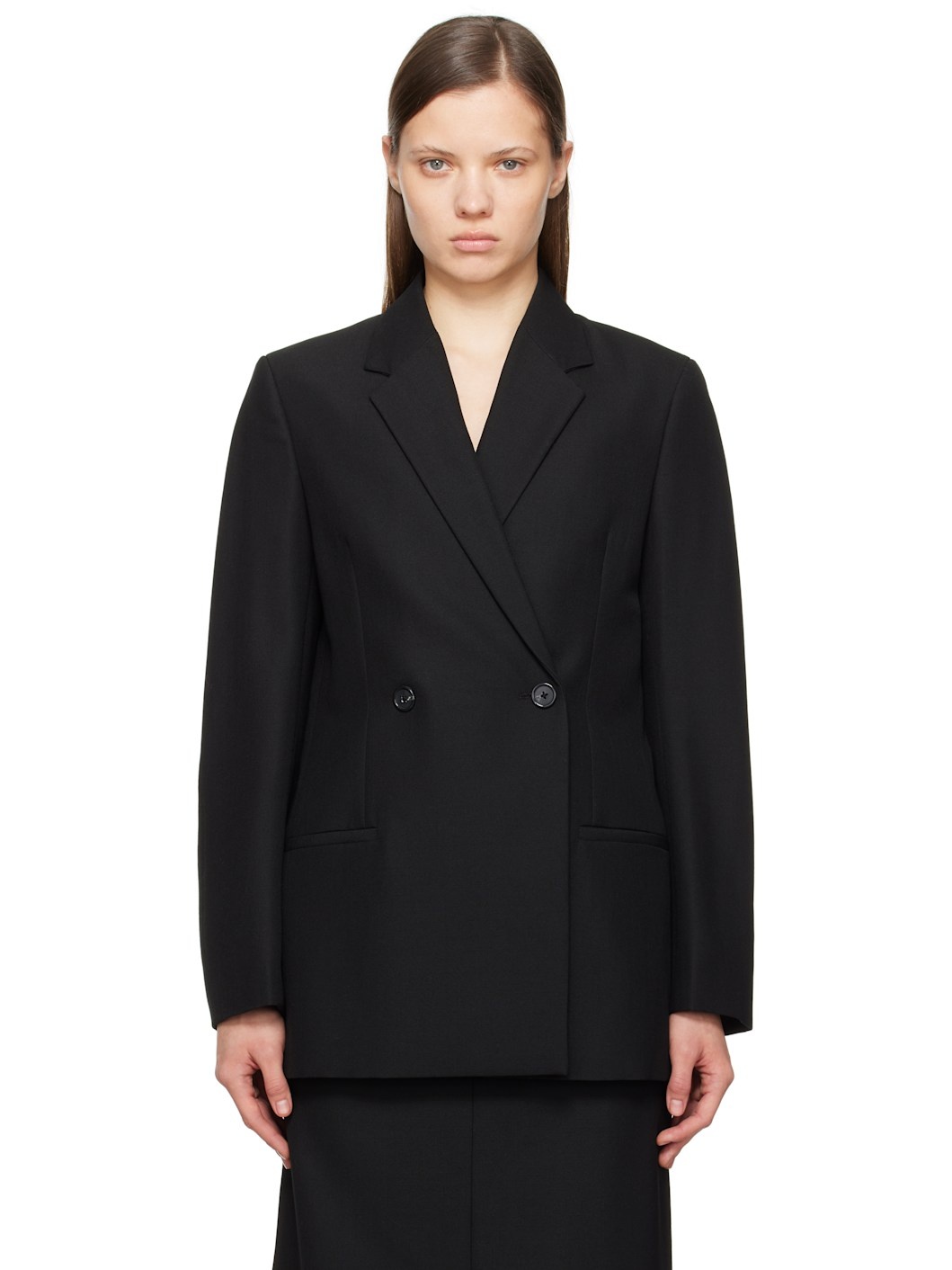 Polyester- and RWS-certified wool-blend barathea blazer. · Notched lapel · Double-breasted button closure · Darts at front · Welt pockets · Padded shoulders · Twin vents at back hem · Welt pocket at interior · Full satin lining Supplier color: Black Body: 55% polyester, 45% wool. Lining: 100% viscose. Made in Romania 251771F057001