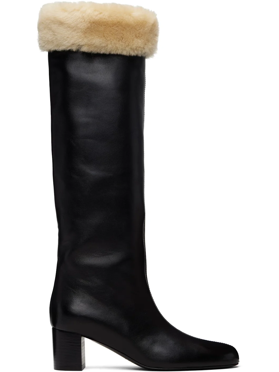 Knee-high buffed nappa sheepskin slip-on boots. · Fold-down shearling collar · Shearling lining · Stacked block heel with rubber injection · Leather sole · Heel: H2" Supplier color: Black/Beige Upper: sheepskin. Sole: leather. Made in Italy 261771F115001