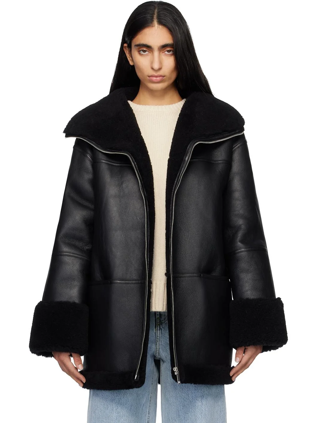 Heavyweight grained lambskin jacket. · LWG-certified lambskin · Paneled construction · Funnel neck · Shearling trim at collar, hem, and cuffs · Zip closure · Welt pockets at waist · Dropped shoulders · Full shearling interior Supplier color: Black 100% lambskin. Made in Turkey 251771F062008
