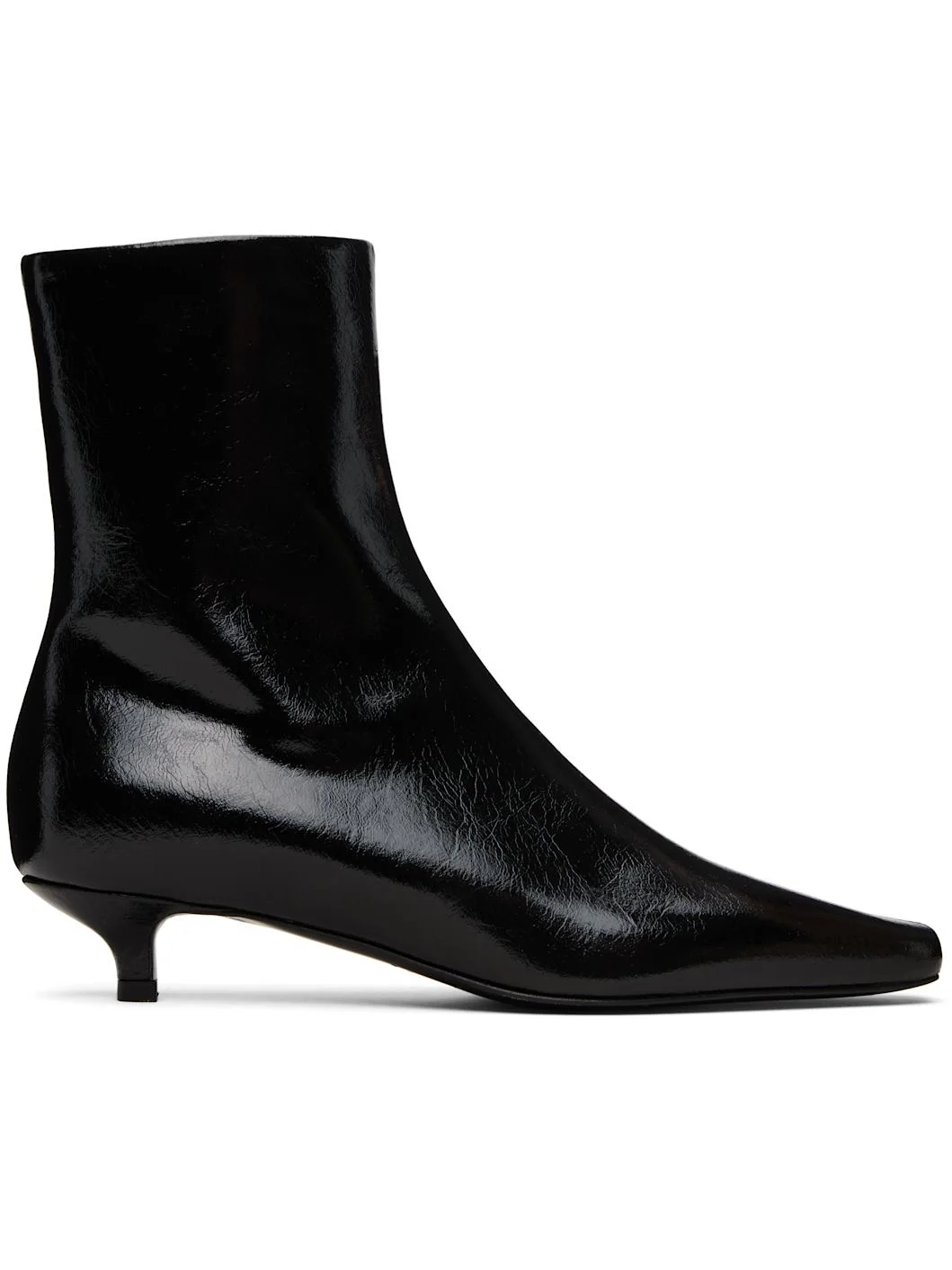 Ankle-high crinkled patent calfskin boots. · Pointed square toe · Zip closure at inner side · Buffed sheepskin lining · Kitten heel with rubber injection · Leather sole with rubber injection · Heel: H1.25" Part of the TOTEME Garderob collection. Supplier color: Black Upper: calfskin. Sole: leather. Made in Italy 261771F113000