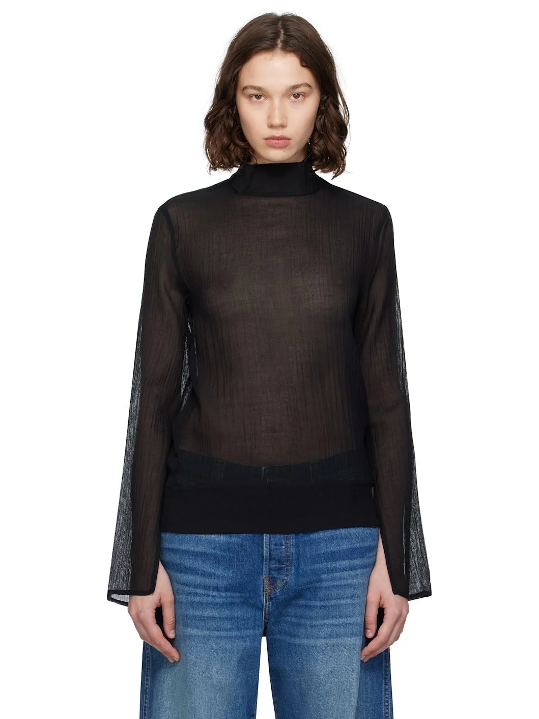 Semi-sheer cotton- and silk-blend gauze blouse. · Mock neck · Slit at cuffs · Concealed zip closure at back Supplier color: Black 79% cotton, 21% silk. Made in Portugal 252771F107004