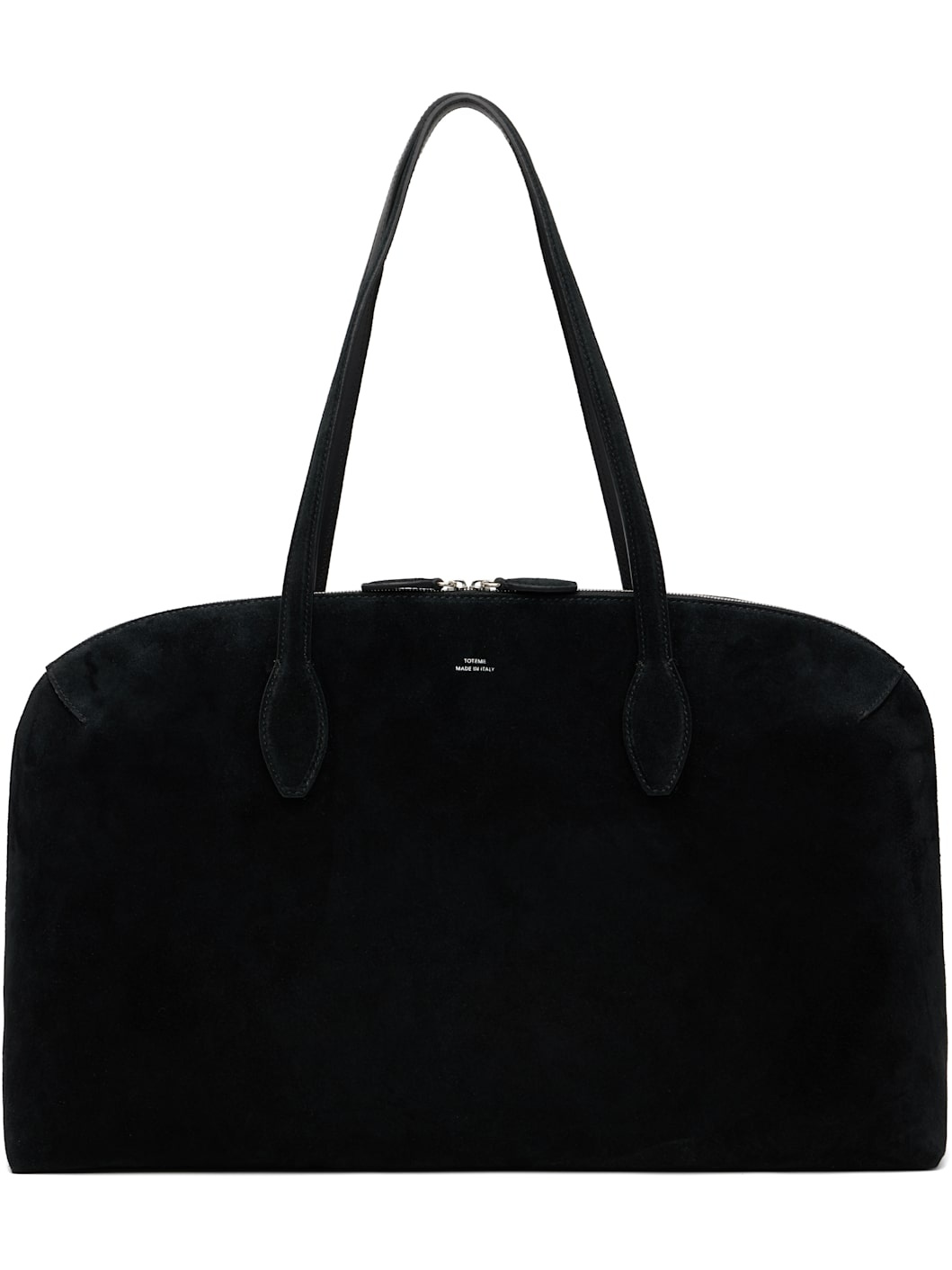 Suede tote. · Fixed shoulder straps · Logo stamp at face · Zip closure · Zip pocket and patch pockets at interior · Microsuede lining · Silver-tone hardware · H10" x W17.5" x D8.5" Supplier color: Black Leather. Made in Italy 252771F049001