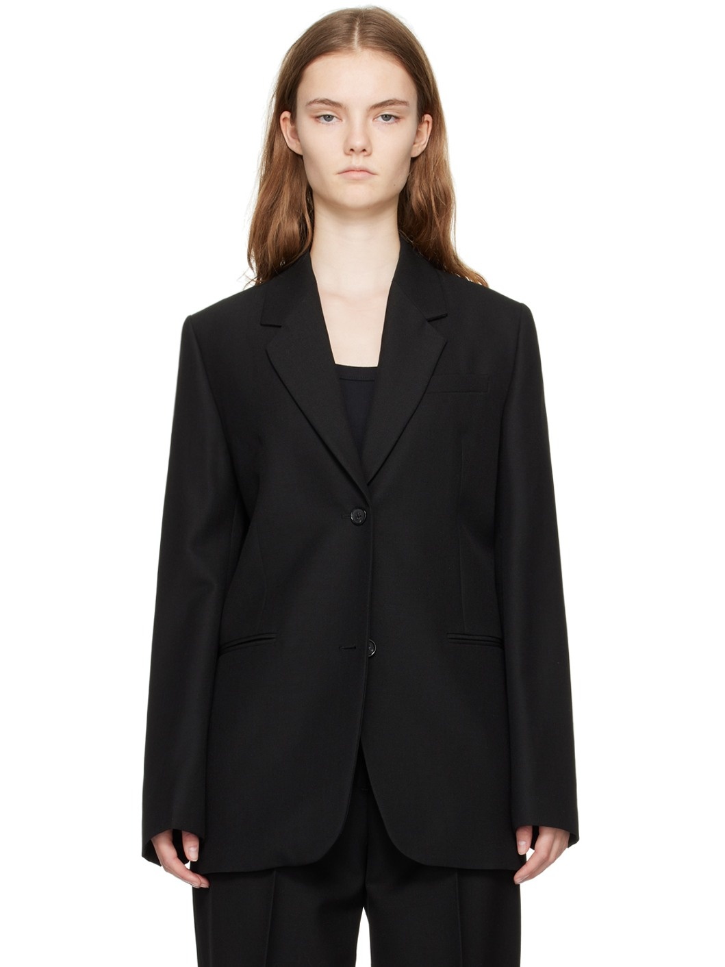 Virgin wool- and recycled polyester-blend barathea blazer. · Paneled construction · Notched lapel · Two-button closure · Patch pocket · Welt pockets · Padded dropped shoulders · Four-button surgeon's cuffs · Welt pocket at interior · Full viscose satin lining Supplier color: Black