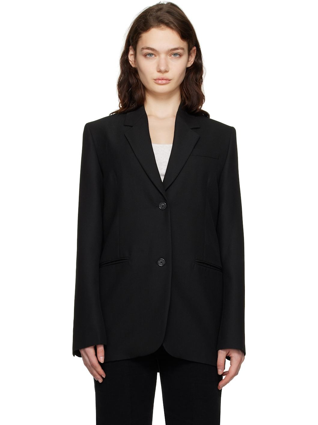 Recycled polyester- and RWS-certified wool-blend barathea blazer. · Notched lapel · Two-button closure · Welt pockets · Darts at front · Padded shoulders · Four-button surgeon's cuffs · Welt pocket at interior · Full satin lining Supplier color: Black Body: 55% recycled polyester, 45% wool. Lining: 100% viscose. Made in Romania 251771F057000