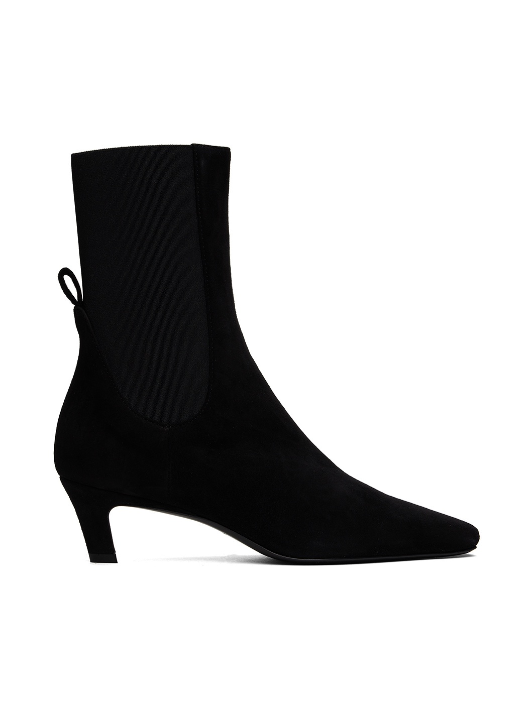Ankle-high LWG-certified sheepskin suede boots in black. · Pointed square toe · Elasticized gusset at collar · Pull-loop at heel tab · Grained sheepskin lining · Covered kitten heel with rubber injection · Leather sole · Heel: H2" Supplier color: Back suede Upper: sheepskin. Sole: leather, rubber. Made in Italy 242771F113003