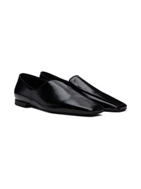 Crinkled Naplack leather loafers in black. · LWG-certified leather · Pointed square toe · Grosgrain piping at vamp and collar · Logo stamp at padded sheepskin footbed · Buffed sheepskin and suede lining · Stacked leather heel with rubber injection · Polished leather sole Supplier color: Black Upper: calfskin, sheepskin. Sole: leather. Made in Italy 242771F121011