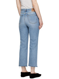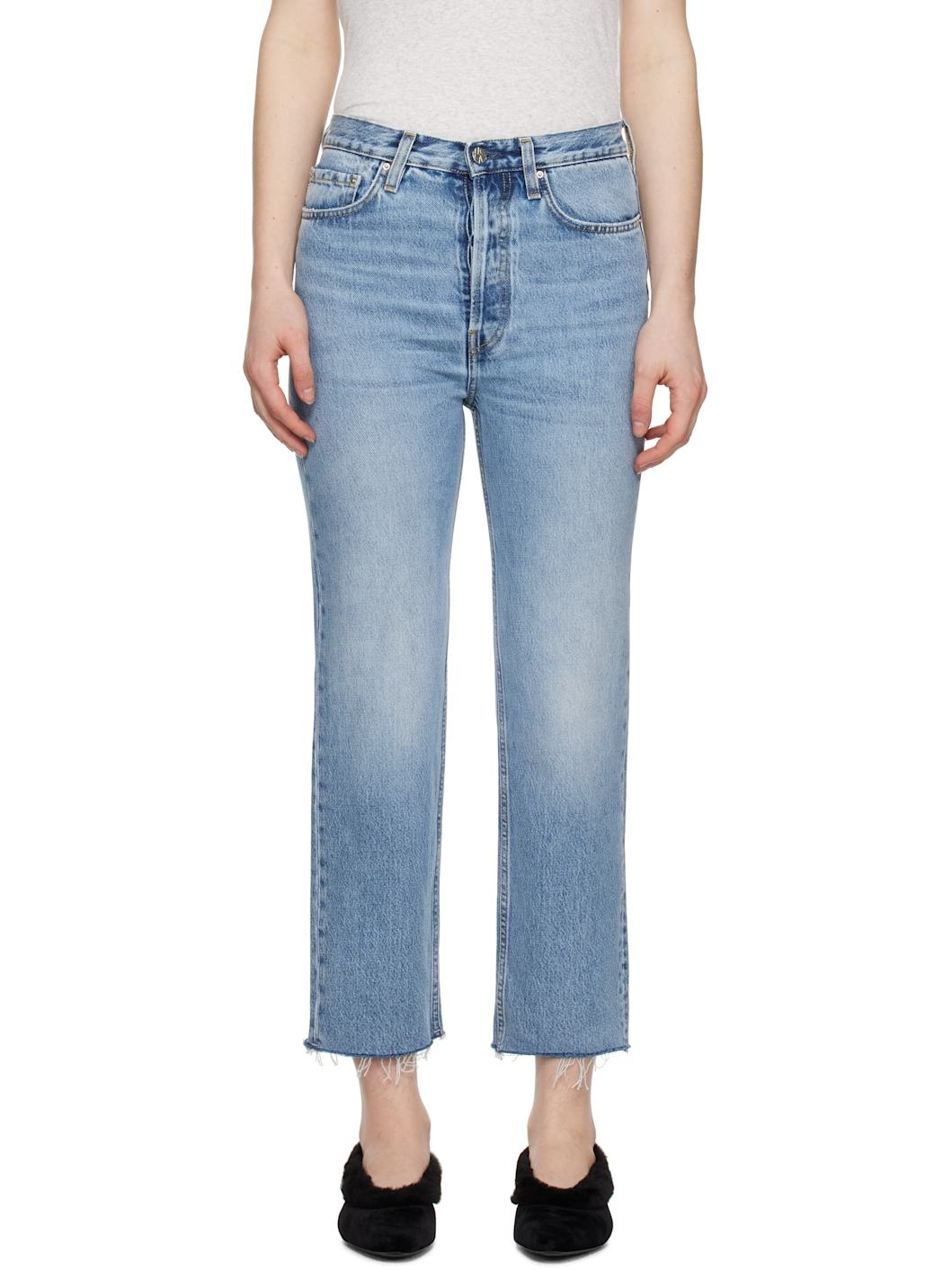 Non-stretch organic cotton denim jeans. Distressing, fading, and whiskering throughout. · Slim-fit and straight-leg · Mid-to high- rise · Belt loops · Five-pocket styling · Zip fly · Cropped legs · Raw edge at cuffs · Leather logo patch at back · Logo-engraved silver-tone hardware · Contrast stitching in yellow Supplier color: Worn blue 100% organic cotton. Made in Italy 251771F069006