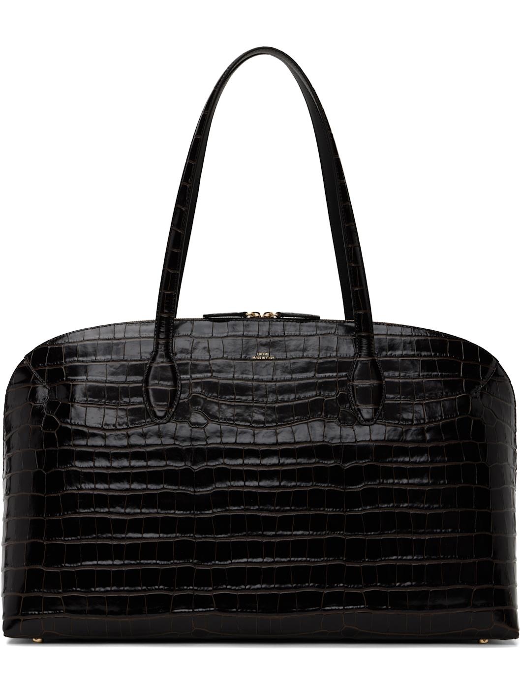 LWG-certified croc-embossed leather tote in brown. · Fixed shoulder straps · Gold-tone logo stamp at face · Bumper studs at base · Zip closure · Zip pockets and patch pockets at interior · Microsuede lining · H11" x W17.5" x D6" Part of the Garderob collection. Supplier color: Dark chocolate Leather. Made in Italy 252771F049002