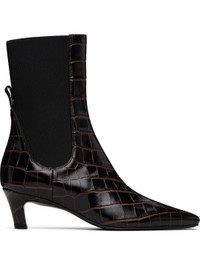 Ankle-high LWG-certified croc-embossed leather boots in brown. · Square toe · Elasticized panel at sides · Pull-loop at heel counter · Covered kitten heel with rubber injection · Polished calfskin sole · Heel: H2" Supplier color: Dark brown Upper: leather. Sole: calfskin. Made in Italy 252771F113001