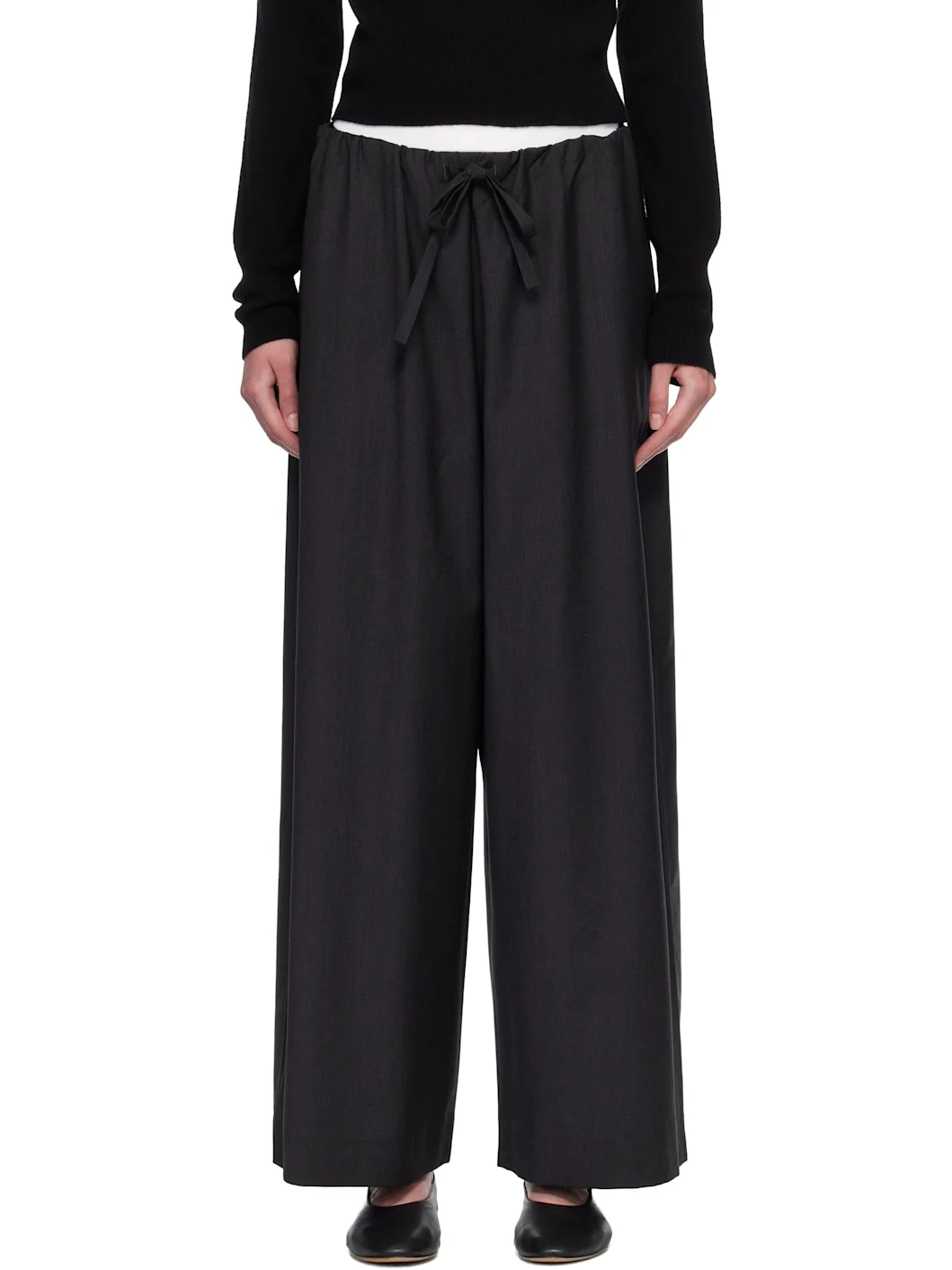 Lightweight wool canvas trousers. · Straight-leg, loose-fit · Drawstring at elasticized waistband · Two-pocket styling Supplier color: Charcoal Melange 100% wool. Made in Portugal 261771F087007