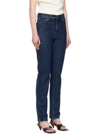Non-stretch organic cotton denim jeans. Fading and whiskering throughout. · Slim-fit · High-rise · Belt loops · Five-pocket styling · Zip fly · Logo patch at back waistband · Contrast stitching in tan Supplier color: Indigo 100% cotton. Made in Italy 252771F069000