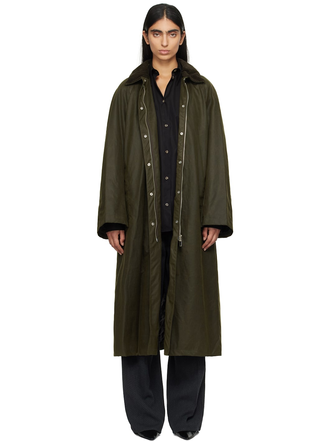 Insulated wax-coated organic cotton duck canvas coat. · Oversized · Corduroy trim at spread collar · Two-way zip closure with press-stud placket · Welt pockets · Raglan sleeves · Central vent at back hem · Welt pocket at interior · Full quilted batiste lining · Logo-engraved silver-tone hardware Supplier color: Forest Body: 100% organic cotton. Fill: 100% polyester. Lining: 100% viscose. Made in Romania 242771F059004