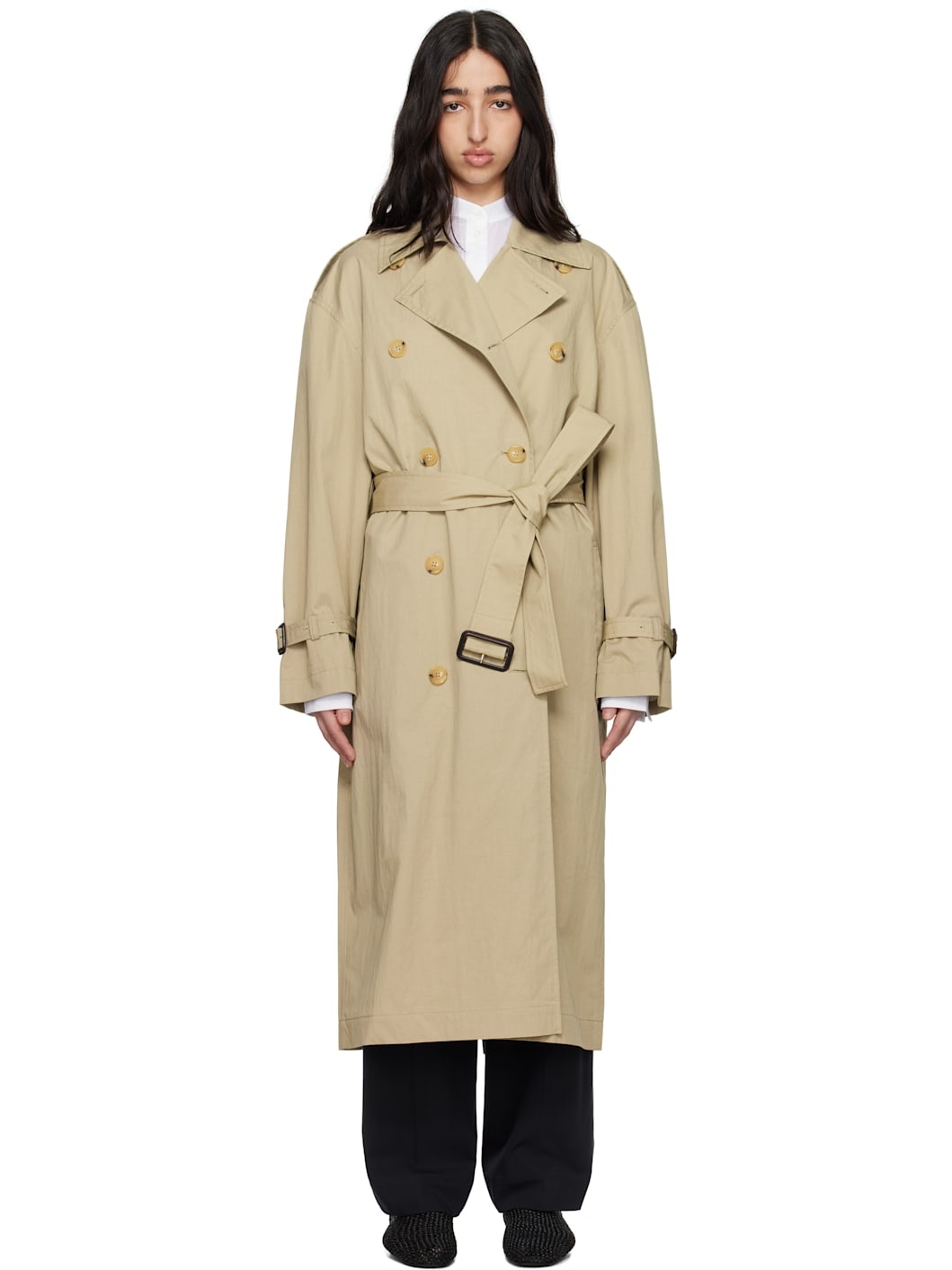 Organic cotton-blend gabardine trench coat. · Lightweight and water-resistant · Spread collar · Double-breasted button closure · Belt loops and self-tie belt · Welt pockets · Epaulets · Dropped shoulders · Belt loops and pin-buckle strap at cuffs · Storm flap with inverted box pleat at back · Central vent at back hem · Unlined Part of the Garderob collection. Supplier color: Clay Body: 65% organic cotton, 35% polyamide. Lining: 54% cotton, 46% viscose. Made in Lithuania 251771F067002