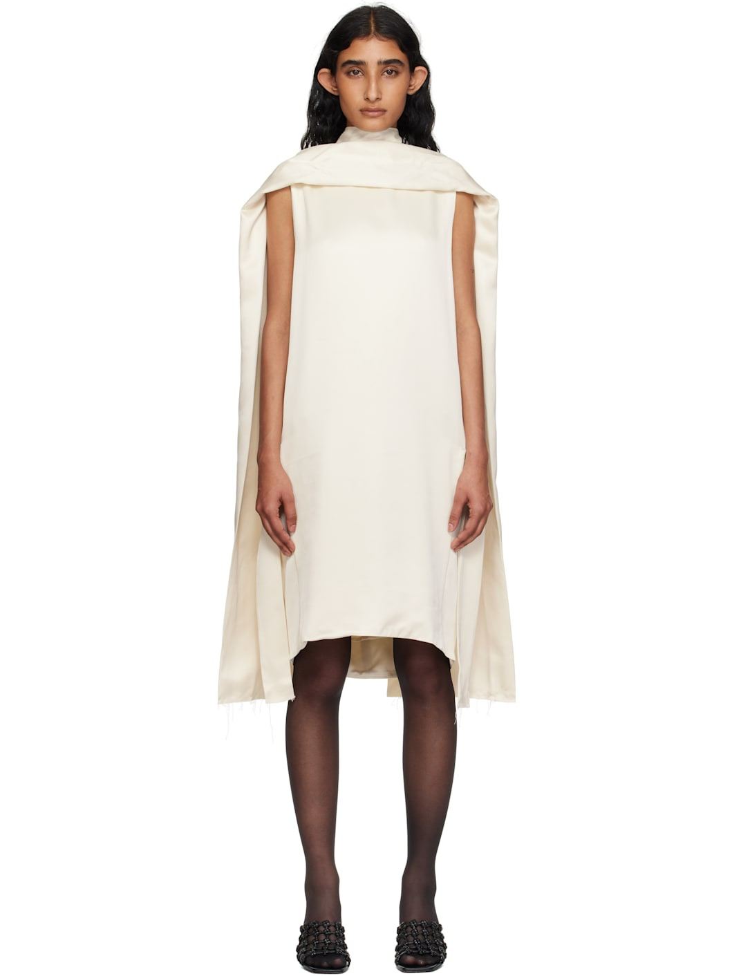 Viscose satin minidress. · Raw edges throughout · Scarf-style panel extends to back · Round neck · Seam pockets · Integrated self-tie belt · Zip closure at back collar Supplier color: Ecru 100% viscose. Made in Portugal 252771F052004