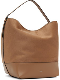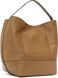 Wool melton and buffed leather tote in tan. · Adjustable shoulder strap · Logo stamp at face · Lanyard-clasp fastening at throat · Patch pockets at interior · H14" x W19" x D11" Supplier color: Camel Textile, leather. Made in Italy 251771F049005