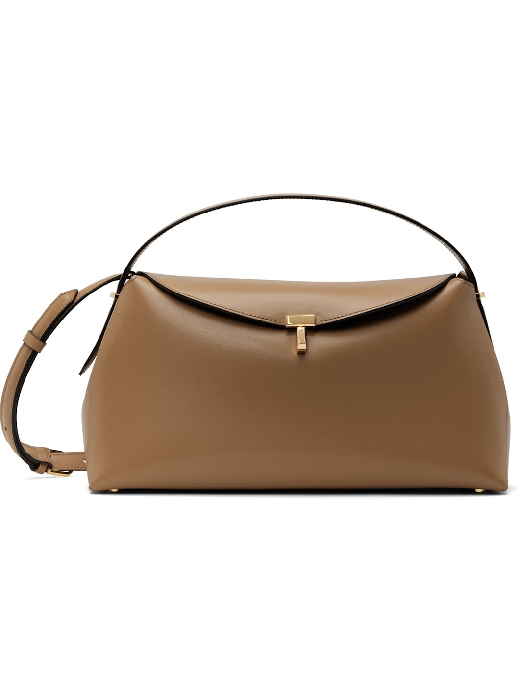 LWG-certified palmellato leather top handle bag in taupe. · Fixed carry handle · Adjustable and detachable crossbody strap · Logo stamp at face · Bumper studs at base · Turn-lock flap · Patch pockets at interior · Microsuede lining · H7" x W13.5" x D4.5" Supplier color: Camel Leather. Made in Italy 252771F046000