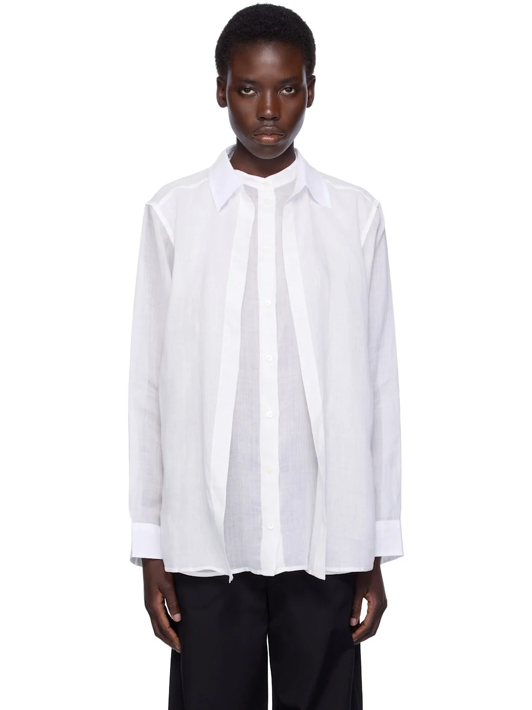Sheer ramie voile shirt. · Layered construction · Spread and band collar · Button closure · Buttoned barrel cuffs · Box pleat at back yoke Supplier color: White 100% ramie. Made in Portugal 252771F109008