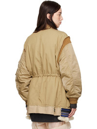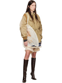 Cotton-blend plain-woven bomber jacket. · Spread collar · Button closure · Flap pockets at front and sleeve · Drawstring at waist · Beaded trim with fringe detailing at hem · Rib-knit at armscyes and cuffs · Welt pockets at interior · Fully lined Supplier color: Beige Body 1: 67% cotton, 33% nylon. Body 2: 100% nylon. Lining 1: 100% rayon. Lining 2: 100% polyester. Trim 1: 100% cotton. Trim 2: 70% acrylic, 30% wool. Fill: 100% polyester. Made in Japan 242414F058002