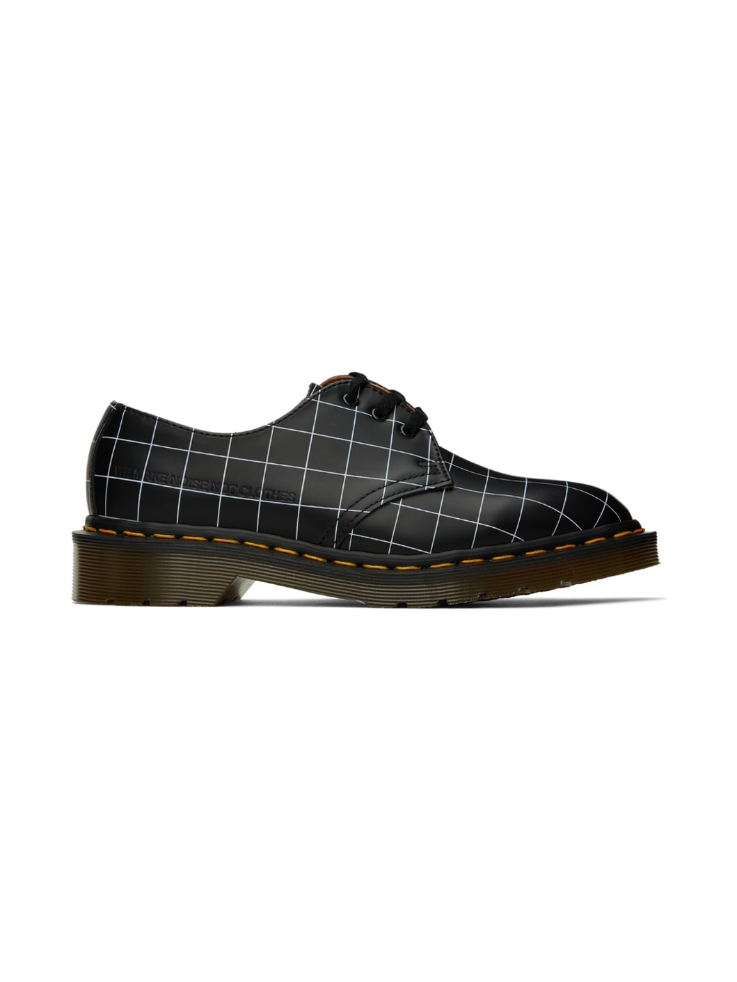 Handcrafted buffed leather oxfords in black. Check pattern throughout. · Lace-up closure · Text embossed at outer side · Buffed leather lining · Signature yellow topstitching at heat-sealed Goodyear welt · Signature treaded Air Cushion rubber sole Part of the Undercover x Dr. Martens collaboration. Supplier color: Black