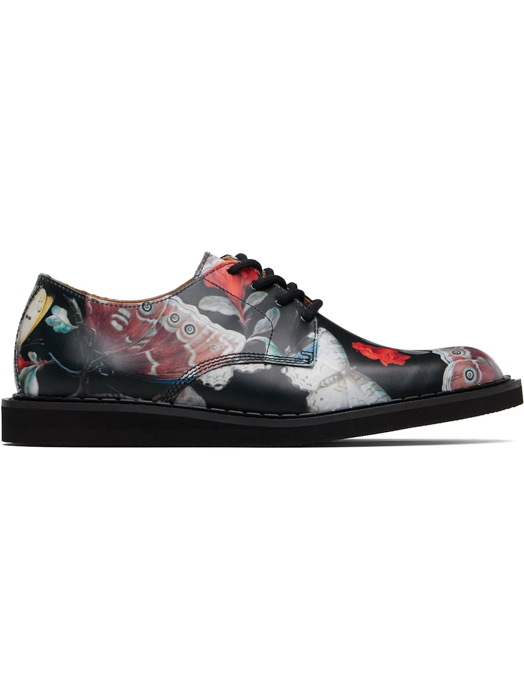 Buffed leather derbys. · Graphic pattern printed throughout · Lace-up closure · Grained leather lining · Topstitching at welt · Foam rubber midsole · Treaded rubber sole Part of the UNDERCOVER x George Cox collaboration. Supplier color: Black (printed) Upper: leather. Sole: rubber. Made in Portugal 252414M225001
