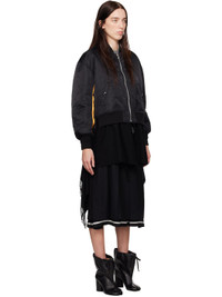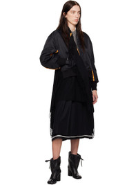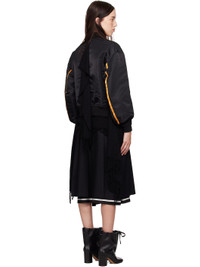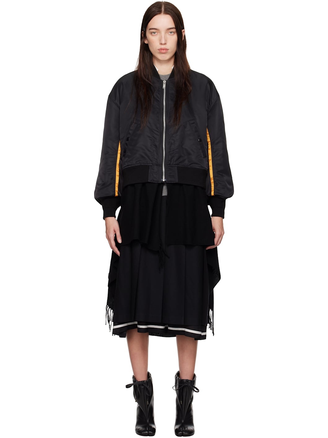 Insulated nylon taffeta bomber jacket. · Rib-knit stand collar, hem, and cuffs · Zip closure · Welt pockets at front · Wool scarf-style trim at hem, side seams, and back · Fringes at trim edges · Dropped shoulders · Raw edge ribbon detailing at sleeves Supplier color: Black Body: 100% nylon. Lining: 100% polyester. Trim 1: 100% wool. Trim 2: 70% acrylic, 30% wool. Made in Japan 242414F058004